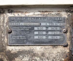 A further data stamp suggests the original paint code was 670H Light Ivory, a period correct colour that suits the Pagoda’s understated lines beautifully. The embossed roundel on another plate appears to be a factory body stamp, a detail sometimes overlooked but useful for authenticity checks.
