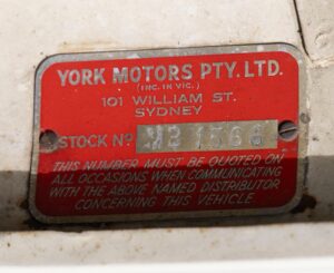Next is the red York Motors plate, which places the car’s first sale through Mercedes-Benz’s key Sydney distributor. That makes this a genuine new delivery Australian Pagoda rather than a later private import. Australian delivered SLs carry strong desirability because their history is easier to verify and they often retain unique distributor documentation.
